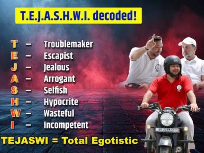 पटनाः बिहार विधानसभा चुनाव को लेकर तमाम सियासी दल अपनी अपनी रणनीति बनाने में जुटे हुए हैं। इसी कड़ी में नेता प्रतिपक्ष तेजस्वी यादव ने बिहार की जनता को यह संदेश दिया है कि वह जब एनडीए के नेता उनके पास पहुंचें तो दस तरह का सवाल जरूर करें। इसके बाद जदयू के मुख्य प्रवक्ता एवं विधान पार्षद नेता नीरज कुमार तेजस्वी यादव के नाम को 'डिकोड' किया है। उन्होंने अपने सोशल मीडिया अकाउंट पर एक फोटो में तेजस्वी के नाम को लेकर ‘तेजस्वी’ का फुल फॉर्म बताया है उन्होंने अपने सोशल मीडिया पोस्ट में लिखा कि इसका मतलब है कि ’टी’- ट्रबलमेकर, (उपद्रवी),’ई’-एस्केपिस्ट (पलायनवादी), ’जे’- जेलियस (ईर्ष्यालु), ’ए’-एरोगेंट-(अभिमानी), ’एस’-सेल्फिश (स्वार्थी), ’एच’-हाइपोक्राइट (पाखंडी), ’डब्ल्यू’-बेस्ट फुल (फिजूलखर्ची), ’आई’-इनकंबटेंट (अयोग्य) और ’टी’-टोटल ईगोइस्ट (पूर्ण अहंकारी) करार दिया। नीरज कुमार ने दावा किया कि बिहार की जनता, खासकर महिलाएं, मुख्यमंत्री नीतीश कुमार पर पूरा भरोसा करती हैं।