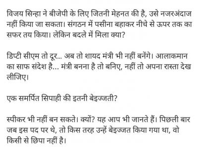 जानकारों के अनुसार विजय सिन्हा तो मात्र एक उदाहरण हैं। ऐसे कई नेता हैं जो पार्टी के लिए झंडा ढोने के दौरान लाठी डंडे खाए, लेकिन वक्त आने पर आयातित व्यक्ति ने सबके अरमानों पर पानी फेर दिया। इसको लेकर दल के अंदर नाराजगी देखी जा रही है।