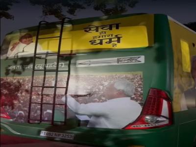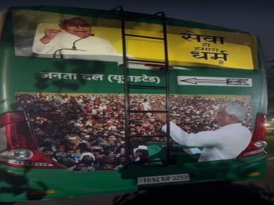 Bihar LS polls 2024: बस पर एक ओर लिखा है- रोजगार मतलब नीतीश कुमार तो दूसरी ओर लिखा है पूरा बिहार हमारा परिवार। रथ का नाम निश्चय रथ रखा गया है।