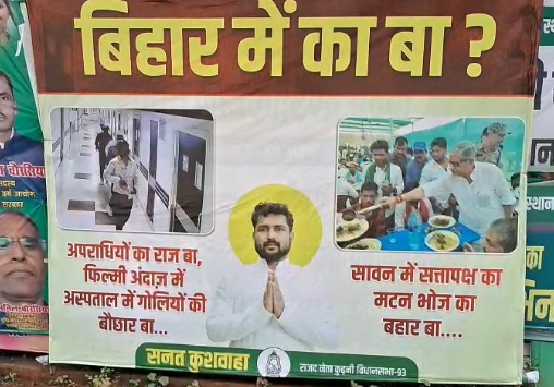 पटनाः बिहार की राजधानी पटना में राजद के कार्यकर्ताओं के द्वारा राजद प्रमुख लालू प्रसाद यादव के आवास के ठीक सामने सहित शहर के कई हिस्सों में 'बिहार में का बा' नाम से पोस्टर लगाए हैं। यह पोस्टर लोक गायिका नेहा सिंह राठौर के चर्चित बोल “बिहार में का बा” से प्रेरित है और इसके जरिए राजद ने सीधे तौर पर नीतीश कुमार के नेतृत्व वाली सरकार पर अपराध नियंत्रण में विफलता और “सामाजिक पहलू” पर सवाल उठाते हुए तीखा हमला बोला है। इन पोस्टरों में बिहार में हो रही आपराधिक घटनाओं का जिक्र करते हुए लिखा गया है कि 'बिहार में का बा।'