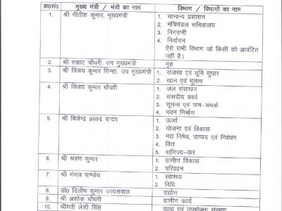 बिहार के मुख्यमंत्री नीतीश कुमार द्वारा विभागों का बंटवारा किए जाने के एक दिन बाद भारतीय जनता पार्टी (भाजपा) की प्रदेश इकाई के अध्यक्ष दिलीप जायसवाल और जनता दल (यूनाइटेड) के अशोक चौधरी समेत कई मंत्रियों ने अपने-अपने विभाग का कार्यभार संभाल लिया। राष्ट्रीय लोक मोर्चा के दीपक प्रकाश ने भी पंचायती राज विभाग का कार्यभार संभाल लिया।