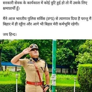 Bihar News: मैंने आज भारतीय पुलिस सर्विस (आईपीएस) से त्यागपत्र दिया है परन्तु मैं बिहार में ही रहूँगा और आगे भी बिहार मेरी कर्मभूमि रहेगी। जय हिन्द।
