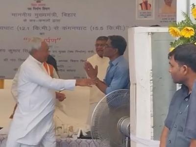 पटनाः बिहार के मुख्यमंत्री नीतीश कुमार ने बुधवार को पटना में मरीन ड्राइव के तीसरे फेज का लोकार्पण किया। लोकार्पण के दौरान एक अजीब वाक्या हुआ। लोकार्पण करने के बाद मुख्यमंत्री जैसे ही वहां से चलने के लिए उठे तो सामने खड़े निर्माण एजेंसी के इंजीनियर को बुलाकर हाथ जोड़ने लगे और पैर छूने की कोशिश की। यह नजारा देखकर वहां मौजूद दोनों उप मुख्यमंत्री विजय कुमार सिन्हा और सम्राट चौधरी के साथ-साथ विधानसभा अध्यक्ष नंदकिशोर यादव हैरान रह गए। इसका एक वीडियो तेजी से वायरल हो रहा है। मुख्यमंत्री नीतीश कुमार ने प्रोजेक्ट इंजीनियर से कहा कि तेजी से काम को पूरा करें।