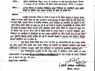 चिट्ठी में यह भी कहा गया है कि उन्होंने विगत वर्षों से उत्पाद विभाग में कार्यरत इंस्पेक्टर दरोगा सिपाही के साथ उनके रिश्तेदारों की चल अचल संपत्ति की जांच करने के साथ परिवार के सदस्यों के मोबाइल लोकेशन की भी जांच करने को कहा है.