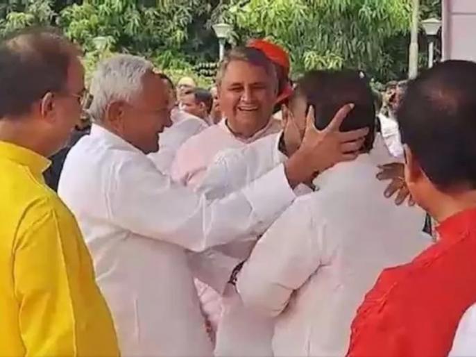 Bihar Politics News: बिहार के मुख्यमंत्री नीतीश कुमार लंबे समय बाद एक बार फिर अपने पुराने अंदाज में नजर आए। उन्होंने माथे पर तिलक लगाए तीन मंत्रियों उप मुख्यमंत्री विजय कुमार सिन्हा, पर्यावरण एवं वन मंत्री प्रेम कुमार और ग्रामीण कार्य मंत्री डॉ. अशोक चौधरी का ललाट मिलन कराया। यह मिलन मंगलवार को विधान मंडल परिसर में आयोजित एक समारोह में किया गया। मुख्यमंत्री ने एक बार फिर अशोक चौधरी की गर्दन पकड़ ली और पहले उनका सिर मंत्री प्रेम कुमार के सिर से लड़ाया और उसके बाद उपमुख्यमंत्री विजय कुमार सिन्हा के सिर से उनका सिर लड़ा दिया।
