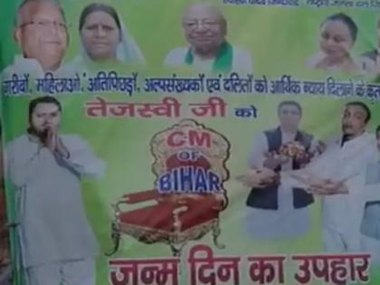 पटनाः बिहार विधानसभा चुनाव के बीच एक बार फिर से पोस्टर पॉलिटिक्स शुरू हो गया है। नेता प्रतिपक्ष तेजस्वी यादव के जन्मदिन से पहले पटना की सड़कों पर जश्न का माहौल नजर आ रहा है। दरअसल, 9 नवंबर को 36 साल के होने जा रहे तेजस्वी को खास महसूस कराने के लिए राजद समर्थकों ने शहरभर में बड़े-बड़े पोस्टर लगाकर अपने नेता के प्रति उत्साह और समर्थन जाहिर किया है। राजधानी पटना के चौक-चौराहों को बधाई पोस्टरों से पाट दिया गया है, लेकिन इन पोस्टरों में सबसे खास है कार्यकर्ताओं की ओर से दिया गया 'उपहार' मुख्यमंत्री की कुर्सी, जिसकी खूब चर्चा हो रही है।