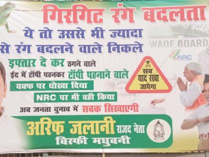 वक्फ पर तो बिल्कुल भी साथ नहीं। वोट लेंगे तुम्हारा लेकिन साथ नहीं देंगे।” यह पोस्टर पूर्व मुख्यमंत्री राबड़ी देवी के आवास के बाहर लगाया गया है और इसमें नीतीश कुमार की तस्वीर भी शामिल है। इसमें उन्हें राष्ट्र स्वयं सेवक संघ के गणवेश में दिखाकर उनकी आलोचना की गई है। पोस्टर राजद नेता आरिफ जिलानी के द्वारा मुख्यमंत्री नीतीश कुमार के वक्फ संशोधन विधेयक पर उनके रुख को लेकर यह पोस्टर लगाया है। पोस्टर में राजद ने मुख्यमंत्री नीतीश कुमार की तुलना गिरगिट से की है। पोस्टर में मुख्यमंत्री नीतीश कुमार की तीन तरह की तस्वीरें दिखाई गई है।