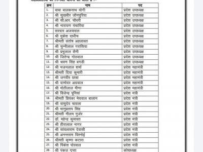 इस संबंध में भाजपा की ओर से मिली जानकारी के अनुसार पार्टी ने 11 प्रदेश उपाध्यक्ष, 5 प्रदेश महासचिव, 11 प्रदेश मंत्री, एक कोषाध्यक्ष और एक सह-कोषाध्यक्ष सहित 29 पदाधिकारियों की नई सूची में जगह दी है।