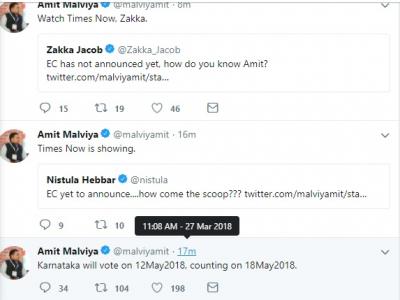 दिल्ली, 27 मार्च: मंगलवार (27 मार्च) को भारतीय जनता पार्टी के आईटी सेल के प्रमुख अमित मालवीय ने भारतीय निर्वाचन आयोग से पहले ही कर्नाटक विधान सभा चुनाव 2018 के लिए होने वाले मतदान की तारीख ट्वीट कर दी। चुनाव आयोग द्वारा मंगलवार को प्रेस वार्ता में कर्नाटक चुनाव के तारीख का ऐलान किया जा रहा था। मुख्य चुनाव आयुक्त ओपी रावत कर्नाटक चुनाव से जुड़े तथ्य और अन्य आंकड़े पत्रकारों को बता रहे थे इसी बीच अमित मालवीय ने ट्वीट कर दिया, "कर्नाटक में 12 मई 2018 को मतदान होगा। मतगणना 18 मई को होगा।" पत्रकार वार्ता के दौरान जब पत्रकारों ने चुनाव आयोग से पूछा कि अमित मालवीय को चुनाव की तारीख के बारे में पता चला तो चुनाव आयुक्त रावत ने कहा कि उन्हें इसके बारे में नहीं पता और आयोग इस बाबत नियमों के तहत सख्त कार्रवाई करेगा। हालाँकि अमित मालवीय के ट्वीट के आने के बाद चुनाव आयोग ने जब तारीखों की घोषणा की और बताया कि कर्नाटक में 12 मई को मतदान होगा और 15 मई को मतगणना होगी।