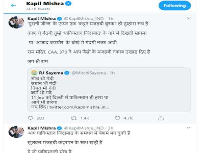 आरजे सायमा के इस ट्वीट पर कपिल मिश्रा भड़क गए और उनके ट्वीट को रिट्वीट करते हुए लिखा, 'आप पाकिस्तान जिंदाबाद के समर्थन में बेशर्म बन चुकी हैं, खुलकर मजहबी कट्टरपन के साथ खड़ी हैं, ये जो पाकिस्तानी सोच हैं, इसी की बात मैं कर रहा था। हां हम हारे है चुनाव, लेकिन आपकी पाकिस्तानी सोच से लड़ना बंद कर देंगे, बोलना बंद कर देंगे, ये गलतफहमी मत पालना, ठोक के लड़ेंगे।'