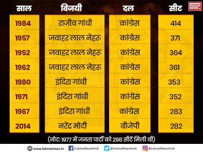 भारत के प्रथम प्रधानमंत्री जवाहर लाल नेहरू ने अब तक तीन बार कांग्रेस को अपने दम पर बहुमत दिलाई है। तीनों बार कांग्रेस ने 360 से ज्यादा सीटों पर जीत हासिल की थी। वहीं देश की पहली महिला प्रधानमंत्री इंदिरा गांधी ने तीन बार कांग्रेस पार्टी को 280 से ज्यादा सीटों पर जीत दिलाई है। दो बार कांग्रेस को उनके नेतृत्व में 350 से ज्यादा सीटें मिली है। वहीं भारत के संसदीय इतिहास सिर्फ एक बार कोई पार्टी 400 पार पहुंची है। 1984 में इंदिरा गांधी के हत्या के बाद हुए चुनाव में राजीव गांधी के नेतृत्व में कांग्रेस ने 414 सीटों पर जीत हासिल की थी।