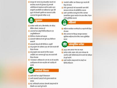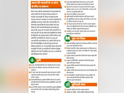 संकल्प पत्र में आगे लिखा है कि 2022 में आजादी की 75वीं वर्षगाठ पर हमारी पार्टी देश के लिए निम्नलिखित लक्ष्यों को पूरा करने पर विश्वास करती है। ये 75 महत्वपूर्ण पड़ाव भारत को मजबूती देंगे और हर भारतीय के जीवन में सुखद परिवर्तन लाएंगे।