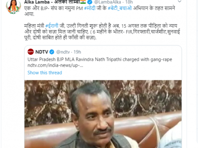 उत्तर प्रदेश के भदोही से भाजपा विधायक रवींद्रनाथ त्रिपाठी सहित सात लोगों के खिलाफ बुधवार को सामूहिक बलात्कार का मामला दर्ज किया गया। इस घटना को लेकर कांग्रेस की नेता अलका लाम्बा प्रधानमंत्री नरेंद्र मोदी सरकार पर निशाना साधा है। लाम्बा ने ट्वीट किया 'एक और बीजेपी-संघ का नमुना पीएम मोदी जी के बेटी_बचाओ अभियान के तहत सामने आया। महिला मंत्री ईरानी जी, उल्टी गिनती शुरू होती है अब, 15 अगस्त तक पीड़िता को न्याय और दोषी को सज़ा मिल जानी चाहिए। ( 6 महीने के भीतर- FIR,गिरफ्तारी,चार्जशीट,सुनवाई पूरी, दोषी साबित होते ही फाँसी की सज़ा)।