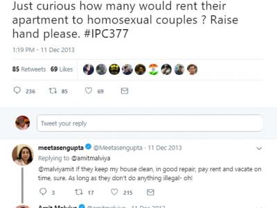 अमित मालवीय ने भले ही कल से अब तक समलैंगिकता को गैर-आपराधिक बनाये जाने पर एक भी ट्वीट न किया हो, कुछ लोगों ने उनका साल 2013 का एक ट्वीट रीट्वीट किया है। दिसम्बर 2013 में अमित मालवीय ने समलैंगिकता के मुद्दे पर ट्वीट करते हुए पूछा था, "बस ये जानना चाहता हूँ कि कितने लोग समलैंगिक जोड़ों को अपने अपार्टमेंट में किरायेदार रखेंगे? अपने हाथ उठाएँ।" जाहिर है अमित मालवीय का पुराना ट्वीट सुप्रीम कोर्ट के ताजा फैसले की भावनाओं के विपरीत प्रतीत होता है।