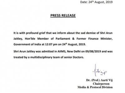 अरुण जेटली (Arun Jaitley) का दिल्ली स्थित AIIMS अस्पताल में शनिवार को दोपहर 12 बजकर 7 मिनट पर निधन हो गया। वरिष्ठ बीजेपी नेता लम्बे समय से गम्भीर रूप से बीमार थे और उन्हें नौ अगस्त से ECMO और IABP सपोर्ट पर रखा गया था। ख़राब सेहत के कारण ही पूर्व वित्त मंत्री जेटली ने दूसरी नरेंद्र मोदी सरकार में केंद्रीय मंत्रिमंडल में शामिल होने से मना कर दिया था। अरुण जेटली पहली नरेंद्र मोदी सरकार में वित्त मंत्री रहे थे। जेटली अटल बिहारी वाजपेयी सरकार में सूचना एवं व प्रसारण मंत्री रहे थे। जेटली के निधन पर राष्ट्रपति रामनाथ कोविंद, प्रधानमंत्री नरेंद्र मोदी और गृह मंत्री अमित शाह ने गहरा शोक व्यक्त किया है। जेटली के निधन पर क्रिकेट और बॉलीवुड जगत के प्रमुख हस्तियाँ भी शोक व्यक्त कर रही हैं।