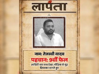 BJP ने तेजस्वी यादव पर कसा तंज, जारी किया पोस्टर; लिखा- "तेजस्वी यादव ‘लापता’, ‘पहचान: 9वीं फेल"