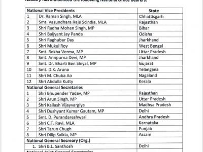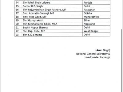 लंबे अरसे तक पार्टी के अल्पसंख्यक मोर्चा के अध्यक्ष अब्दुल रशीद अंसारी की जगह जमाल सिद्दिकी को नई जिम्मेदारी सौंपी गई है। प्रवक्ताओं की सूची का विस्तार करते हुए 23 नेताओं को जिम्मेदारी सौंपी गई है। अनिल बलूनी को पार्टी का मुख्य प्रवक्ता नियुक्त किया है। साथ ही वे पार्टी के मीडिया विभाग के प्रमुख के पद पर भी बने रहेंगे। प्रवक्ताओं की सूची से मीनाक्षी लेखी को बाहर कर दिया गया है। नए प्रवक्ताओं में पूर्व केंद्रीय मंत्री राज्यवर्धन सिंह राठौर, सांसदों में अपराजिता सारंगी, हिना गावित, राजू बिष्ट और राजीव चंद्रशेखर शामिल हैं।