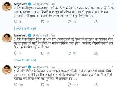 मायावती ने लिखा कि कांग्रेस के नेतृत्व में आज विपक्ष की बुलाई गई बैठक में बीएसपी का शामिल होना, यह राजस्थान में पार्टी के लोगों का मनोबल गिराने वाला होगा।