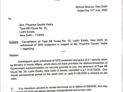 नई दिल्ली:कांग्रेस महासचिव प्रियंका गाँधी जल्दी ही 35 लोधी एस्टेट के सरकारी बंगले को छोड़ कर अपने निजी आवास में चली जाएँगी। यह फैसला प्रियंका ने उस नोटिस के जवाब में लिया है जो उन्हें आज शहरी विकास मंत्रालय द्वारा सरकारी बंगले को खाली करने के लिए भेजा गया है। नोटिस में मकान खाली कराने का जो कारण बताया गया है उसमें एसपीजी सुरक्षा सरकार द्वारा वापस लिए जाने को आधार बनाया गया है तथा यह भी साफ़ किया गया है की एक जुलाई से यह आवंटन रद्द कर दिया गया है परन्तु वह एक महीने की छूट के तहत एक अगस्त या उससे पूर्व आवास को खाली कर दें।