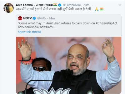 संशोधित नागरिकता कानून के विरोध को लेकर देश के कई शहरों में हिंसक झड़पें हुई हैं और इसे वापस लेने की मांग की जा रही है। हालांकि केंद्रीय गृहमंत्री अमित शाह ने इशारों ही इशारों में साफ कर दिया है कि कितना भी विरोध किया जाए, लेकिन सरकार पीछे नहीं हटेगी। इस बीच कांग्रेस की नेता अलका लाम्बा ने अमित शाह पर हमला बोला है।