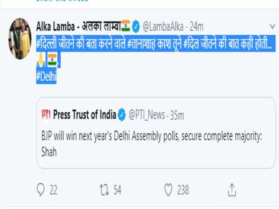 एक अन्य ट्वीट में उन्होंने आगामी दिल्ली विधानसभा चुनाव को लेकर कहा, 'दिल्ली जीतने की बात करने वाले तानाशाह काश तूने दिल जीतने की बात कही होती'