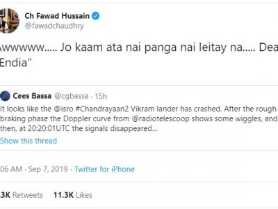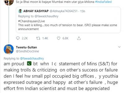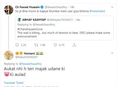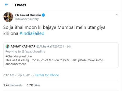 फवाद ने एक भारतीय यूजर के ट्वीट पर बड़ी बेशर्मी से रिट्वीट किया। भारतीय यूजर अभय कश्यप के ट्वीट पर रिट्वीट करते हुए उन्होंने लिखा- सो जा भाई मून की बजाय मुंबई में उतर गया खिलौना। इसके बाद वे ट्रोल हुए, तो लिखा कि मुझे ऐसे ट्रोल किया जा रहा है, जैसे मैंने ही इस मिशन को फेल कर दिया हो।
