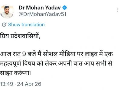 मुख्यमंत्री डॉ. मोहन यादव ने अपने सोशल मीडिया अकाउंट (एक्स) पोस्ट करते हुए लिखा है कि प्रिय प्रदेशवासियों, आज रात 9 बजे मैं सोशल मीडिया पर लाइव में एक महत्वपूर्ण विषय को लेकर अपनी बात आप सभी से साझा करूंगा। मुख्यमंत्री डॉ. मोहन यादव का मानना है कि यह कार्यक्रम केवल औपचारिक बातचीत नहीं, बल्कि मध्यप्रदेश के विकास, जनकल्याण और आने वाले समय की दिशा तय करने का एक महत्वपूर्ण माध्यम है।