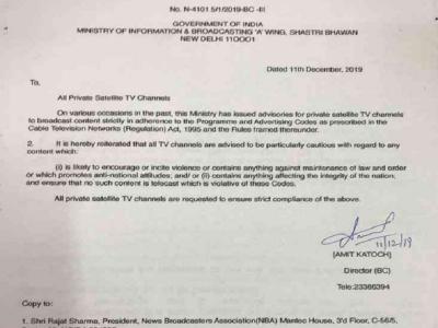 बहरहाल, सरकार की ओर से जारी एडवायजरी में हिंसा को भड़काने वाले कंटेंट नहीं दिखाने से लेकर 'देश-विरोधी नजरिये और ऐसा कुछ भी जो देश की अखंडता को प्रभावित करता हो' से बचने की सलाह दी गई है। एडवायजरी में कहा गया है, सभी प्राइवेट टीवी चैनल से गुजारिश है कि वे बताई गई बातों को सख्त तरीके से पालन करें।