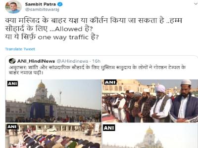 दिल्ली विधानसभा चुनाव के लिए शनिवार को वोटिंग जारी है। इसी बीच भारतीय जनता पार्टी (बीजेपी) के राष्ट्रीय प्रवक्ता संबित पात्रा ने अमृतसर के स्वर्ण मंदिर परिसर के बाहर मुसलमानों के नमाज पढ़ने पर निशाना साधा है। उन्होंने कहा अपने आधिकारिक ट्विटर हैंडल पर लिखा 'क्या मस्जिद के बाहर यज्ञ या कीर्तन किया जा सकता है...हम्म सौहार्द के लिए....अनुमति है? या यह सिर्फ़ वन वे ट्रैफिक है?' दरअसल, पंजाब के अमृतसर में शांति और सांप्रदायिक सौहार्द के लिए मुस्लिम समुदाय के लोगों ने गोल्डन टेम्पल के बाहर नमाज पढ़ी थी।