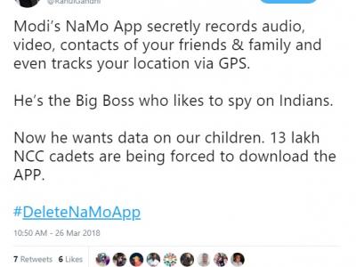 कांग्रेस अध्यक्ष राहुल गांधी ने सोमवार (26 मार्च) को एक बार फिर प्रधानमंत्री नरेंद्र मोदी पर निशाना साधते हुए कहा कि पीएम का NaMo App गुपचुप तरीके से यूजर्स का वीडियो और ऑडियो रिकॉर्ड करता है। कांग्रेस अध्यक्ष ने आरोप लगाया कि NaMo App यूजर्स के दोस्तों और परिजनों के कॉन्टैक्टस भी हासिल कर लेता है और उनके जीपीएस (ग्लोबल पोजिशनिंग सिस्टम) की भी निगरानी करता है। राहुल गांधी ने ट्वीट किया, "वो बिग बॉस की तरह हैं जिस भारतीयों की जासूसी करना पसंद है।" कांग्रेस अध्यक्ष ने आरोप लगाया कि पीएम नरेंद्र मोदी देश के 13 लाख एनसीसी (नेशनल कैडट कोर) के बच्चों से जुड़ा डाटा भी हासिल करना चाहते हैं और इसलिए उन्हें ये ऐप डाउनलोड करने के लिए बाध्य किया जा रहा है। इससे पहले रविवार (25 मार्च) को कांग्रेस अध्यक्ष ने आरोप लगाया था कि प्रधानमंत्री नरेंद्र मोदी NaMo App का डाटा अपने "अमेरिकी दोस्तों" को दे रहे हैं। राहुल गांधी के आरोपों को भारतीय जनता पार्टी (बीजेपी) ने बेबुनियाद बताते हुए उनकी तकनीकी जानकारी पर सवाल उठाया। प्रधानमंत्री कार्यालय (पीएमओ) ने भी राहुल गांधी के आरोपों को बेबुनियाद बताया।
