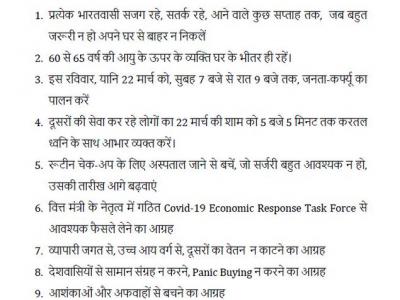 उन्होंने कहा कि 60 से उपर की आयु वाले लोग घरों से बाहर नहीं निकलें और बहुत जरूरी होने पर ही घरों से निकलें। इस दौरान पीएम मोदी जनता से नौ आग्रह किए-