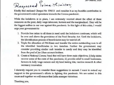 उन्होंने लिखा कि संकट की इस घड़ी में वह सरकार से कुछ निवेदन करते हैं कि जरूरतमंदों को लॉकडाउन की स्थिति में मुफ्त राशन मुहैया कराया जाए।