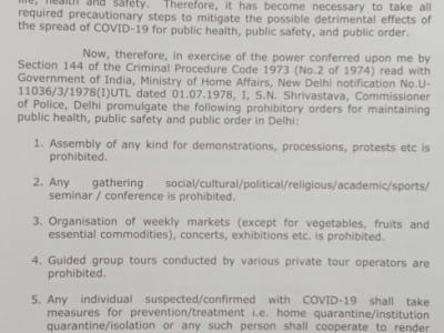कोरोना के बढ़ते प्रकोप को मद्देनजर रखते हुए दिल्ली सरकार ने दिल्ली में 22 मार्च से 31 मार्च तक धारा 144 लगाने का ऐलान किया है।