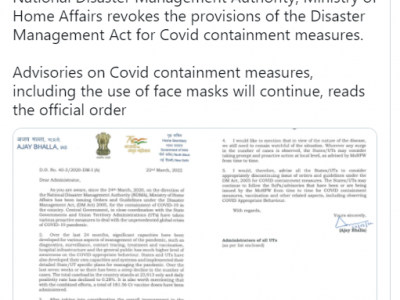 नई दिल्ली: भारत सरकार ने बुधवार को दो सालों बाद गृह मंत्रालय द्वारा जारी आदेश के अनुसार कोविड-19 रोकथाम उपायों के लिए आपदा प्रबंधन अधिनियम के प्रावधानों को रद्द कर दिया। गृह सचिव अजय भल्ला द्वारा हस्ताक्षरित आदेश की कॉपी में लिखा है कि स्थिति में समग्र सुधार और महामारी से निपटने के लिए सरकार की तैयारियों को ध्यान में रखते हुए, राष्ट्रीय आपदा प्रबंधन प्राधिकरण (एनडीएमए) ने निर्णय लिया है कि कोविड-19 रोकथाम उपायों के लिए DM अधिनियम के प्रावधानों को लागू करने की आवश्यकता नहीं है।