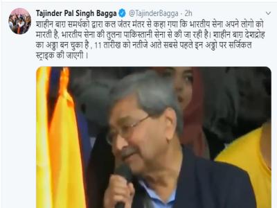 तजिंदर पाल सिंह बग्गा ने एक्टिविस्ट तपन बोस का एक वीडियो ट्वीट कर कहा, 'शाहीन बाग समर्थकों द्वारा कल जंतर मंतर से कहा गया कि भारतीय सेना अपने लोगों को मारती है, भारतीय सेना की तुलना पाकिस्तानी सेना से की जा रही है। शाहीन बाग देशद्रोह का अड्डा बन चुका है, 11 तारीख को नतीजे आते सबसे पहले इन अड्डों पर सर्जिकल स्ट्राइक की जाएगी।'