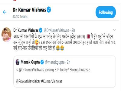 दिल्ली चुनावः कुमार विश्वास के BJP ज्वॉइन करने की चर्चा गरम, ट्वीट कर कहा- मैं कतर में हूं, क्या यहीं से ज्वॉइन कर लूं