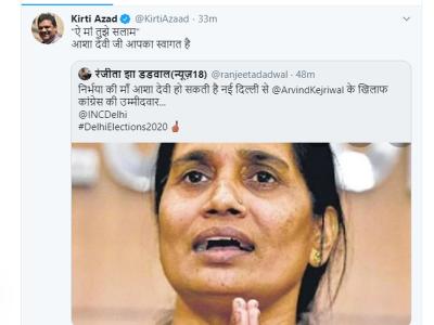 कीर्ति आजाद ने निर्भया की मां आशा देवी को कांग्रेस की ओर से उम्मीदवार बनाए जाने की संभावनाओं के एक ट्वीट पर रिट्वीट करते हुए कहा, 'ऐ मां तुझे सलाम, आशा देवी जी आपका स्वागत है।' हालांकि कांग्रेस की ओर चुनाव लड़ने को लेकर निर्भया की मां आशा देवी ने अभी कोई सूचना नहीं दी है।