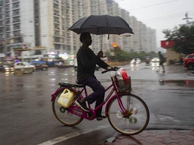 साइकिल और छाताः बिन मौसम बारिश के बाद साइकिल सवार शख्स अपने को बचाता हुआ। राष्ट्रीय राजधानी में हवा की गुणवत्ता नवंबर में 'बहुत खराब' या 'गंभीर' श्रेणी में रही। घर जाने की जल्दबाजी। साइकिल सवार अपने आप को छाता से बचाव करता हुआ।