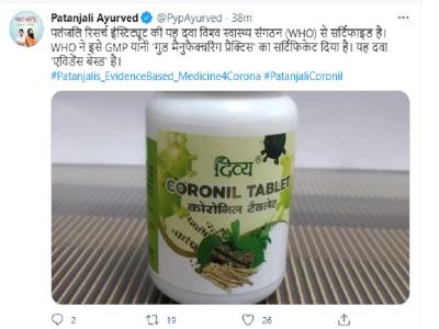 पतंजलि की ओर से ये भी दावा किया गया कि कोरोनिल विश्व स्वास्थ्य संगठन (WHO) से सर्टिफाइड है। दावा किया गया कि WHO ने इसे GMP यानी 'गुड मैनुफैक्चरिंग प्रैक्टिस' का सर्टिफिकेट दिया है और यह दवा 'एविडेंस बेस्ड' है।