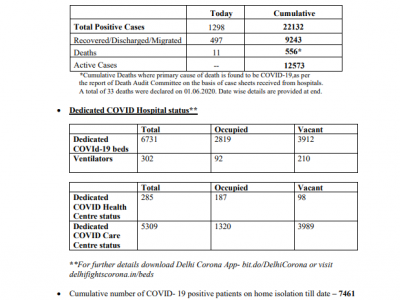 दिल्ली में पिछले 24 घंटे में कोविड 19 के 1298 नए मामले सामने आए हैं. कुल संक्रमित लोगों की संख्या 22132 तक पहुंच गई है. राष्ट्रीय राजधानी में लगातार कोरोना के मामले बढ़ रहे हैं।