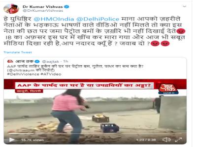 उन्होंने ट्वीट करते हुए लिखा, 'हे युधिष्ठिर अमित शाह और दिल्ली पुलिस माना आपको जहरीले नेताओं के भड़काऊ भाषणों वाले वीडियो नहीं मिलते तो क्या इस नेता की छत पर जमा पेट्रोल बमों के जखीरे भी नहीं दिखाई देते। IB का अफसर इस घर में खींच कर मारा गया और आज भी सबूत मीडिया दिखा रही है, आप नदारद क्यों हैं? जवाब दो?'