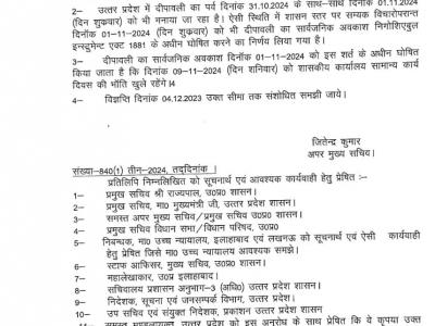 रही बात दीपावली के अवकाश ही तो यूपी में पहले से ही 31 अक्टूबर को दीपावली की छुट्टी थी, लेकिन अब 1 नवंबर की छुट्टी को 9 नवंबर के सेकंड सैटरडे वाले अवकाश से समायोजित किया गया है. इस संबंध में प्रदेश सरकार के अपर मुख्य सचिव सामान्य प्रशासन जितेंद्र कुमार ने निगोशिएबुल इंस्ट्रूमेंट एक्ट के तहत आदेश जारी कर दिया है. सरकारी कर्मचारियों को लगातार 5 दिनों की छुट्टी का लाभ मिलेगा.