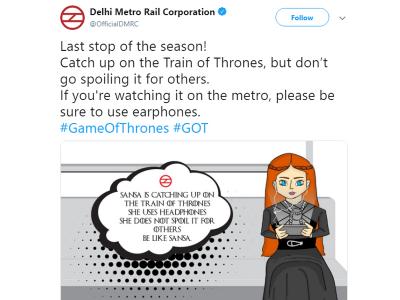 डीएमआरसी ने अपने आधिकारिक अकांउट से ट्वीट किया, ‘‘‘ट्रेन ऑफ थ्रोन्स’ में देखिए सीजन का आखिरी पड़ाव, लेकिन बाकियों का मजा किरकिरा नहीं करें। यदि आप मेट्रो में जीओटी देख रहे हैं, तो ईयरफोन का इस्तेमाल अवश्य करें।’’ इस ट्वीट के साथ ही सीरीज की मुख्य किरदार सांसा स्टार्क का एनिमेटेड पोस्टर भी संलग्न किया गया है। सांसा स्टार्क का किरदार सोफी टर्नर ने निभाया है।