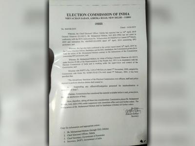 खबर के अनुसार चुनाव आयोग ने एसपीजी सुरक्षा के चुनाव आयोग के निर्देशों के विपरीत कार्य करने के लिए आईएएस मोहम्मद मोहसिन को निलंबित कर दिया गया है। मोहसिन ने मंगलवार को प्रधानमंत्री नरेंद्र मोदी के काफिले की तलाशी लेने की कोशिश की थी, लेकिन उन्हें ऐसा नहीं करने दिया गया था।