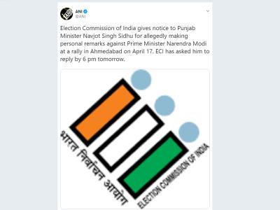 भारतीय चुनाव आयोग ने पंजाब के मंत्री नवजोत सिंह सिद्धू को नोटिस दिया है। आयोग ने यह नोटिस पीएम नरेंद्र मोदी पर व्यक्तिगत टिप्पणी करने के लिए सिद्धू को दिया है। भारतीय चुनाव आयोग ने इस नोटिस का जवाब देने के लिए सिद्धू को कल शाम 6 बजे तक का समय दिया है।