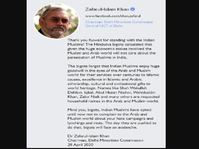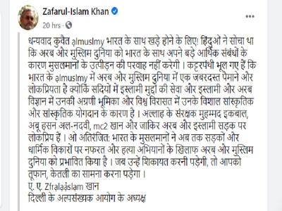 जफरुल इस्लाम ने अपनी फेसबुक पोस्ट में लिखा है, ''धन्यवाद कुवैत, भारतीय मुसलमानों के साथ खड़े होने के लिए! कट्टर हिंदुओं ने सोचा था कि अरब और मुस्लिम देश अपने आर्थिक संबंधों के कारण भारत के मुसलमानों के उत्पीड़न की कोई चिंता नहीं करेंगे। ये कट्टरपंथी भूल गए हैं कि भारत के मुसलमानों की अरब और मुस्लिम दुनिया में जबरदस्त लोकप्रियता है। भारतीय मुसलमानों ने सदियों से पूरी सद्भावना से इस्लाम की सेवा की है। उनकी गिनती हमेशा से इस्लाम के उत्कृष्ट विद्वानों में होती है, जिन्होंने विश्व विरासत में अपना सांस्कृतिक योगदान दिया है। शाह वलीउल्लाह देहलवी, इकबाल, अबुल हसन नदवी, वाहिदुद्दीन खान, जाकिर नाइक का नाम अरब और मुस्लिम देशों के हर घर में बड़े सम्मान से लिया जाता है। अरे कट्टरपंथियो, यह अच्छे से जान लो कि भारतीय मुसलमानों ने अबतक अरब और मुस्लिम जगत से आपके हेट कैम्पेन, लिंचिंग और दंगों की शिकायत नहीं की है। जिस दिन उन्हें ऐसा करने के लिए मजबूर किया जाएगा, उस दिन कट्टरपंथियों को तूफान का सामना करना पड़ेगा।''
