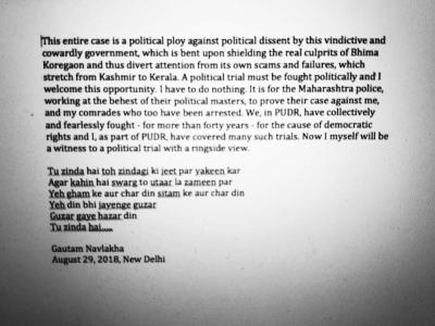 नई दिल्ली, 29 अगस्त: सामाजिक कार्यकर्ता और ईपीडब्ल्यू पत्रिका के पूर्व सलाहकार सम्पादक गौतम नवलखा ने मंगलवार (28 अगस्त) को पुणे पुलिस द्वारा गिफ्तार किये जाने के बाद एक बयान जारी किया है।