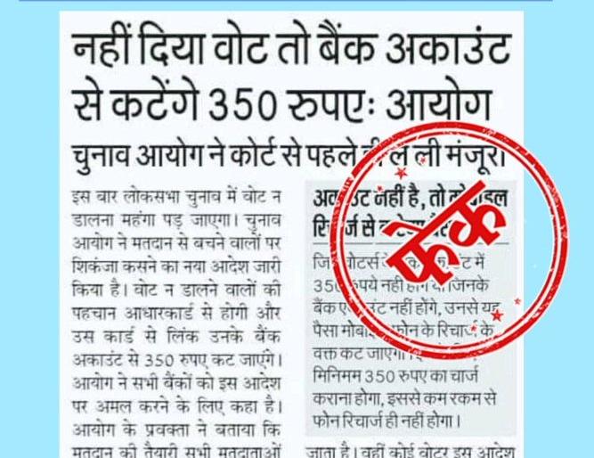 खबर में लिखा गया है कि वोट नहीं दने पर बैंक अकाउंट से 350 रुपये काटे जाएंगे। खबर में यह भी दावा किया जा रहा है कि चुनाव आयोग ने सभी बैंकों को अमल करने के लिए कहा है। यह भी लिखा है कि वोटर कोर्ट नहीं जा पाए इसलिए अयोग ने कोर्ट से पहले ही आदेश ले लिए हैं।