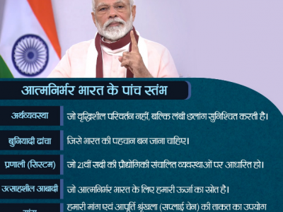 वित्त मंत्री निर्मला सीतरमण ने कहा, 'आत्मनिर्भर भारत के 5 पिलर हैंः इकॉनमी, इन्फ्रास्ट्रक्चर, सिस्टम, डेमोग्राफी और डिमांड'।