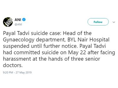 पायल ताडवी आत्महत्या मामले में बीवाईएल नायर हॉस्पिटल के गायनकोलॉजी डिपार्टमेंट के हेड को आगामी नोटिस तक सस्पेंड कर दिया गया है। इसके अलावा हॉस्टल में रहने वाले उन तीन डॉक्टरों को भी सस्पेंड किया गया है जिन पर पायल को प्रताड़ित करने, रैगिंग और उनकी जाति को लेकर परेशान करने के आरोप हैं। पुलिस का कहना है कि हेमा अहूजा, अंकिता खंडेलवाल और भक्ति मेहर तीनों फरार हैं। सर्च टीम उनकी तलाश कर रही है।